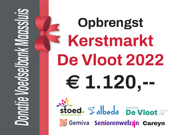 Begin januari mocht Joke Cats, coördinator van de Voedselbank Maassluis, een cheque in ontvangst nemen van 1120 euro. Dit bedrag was de opbrengst van de eerder gehouden kerstmarkt in De Vloot, georganiseerd door de samenwerkende organisaties Albeda, Careyn, Kindcentrum De Vloot, Kogge/Gemiva, Stoed en Seniorenwelzijn.