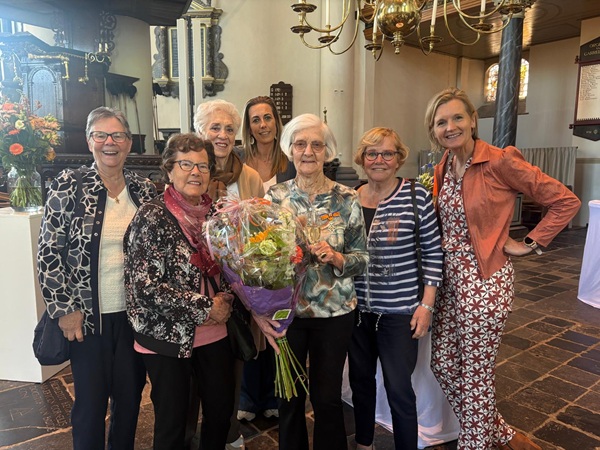 Foto: Mevrouw Bevers-van der Does omringd door collega-vrijwilligers, Annouk Noomen (Consulent vrijwillige inzet bij Naut) en Suzanne Korthorst (Directeur-bestuurder bij Naut).